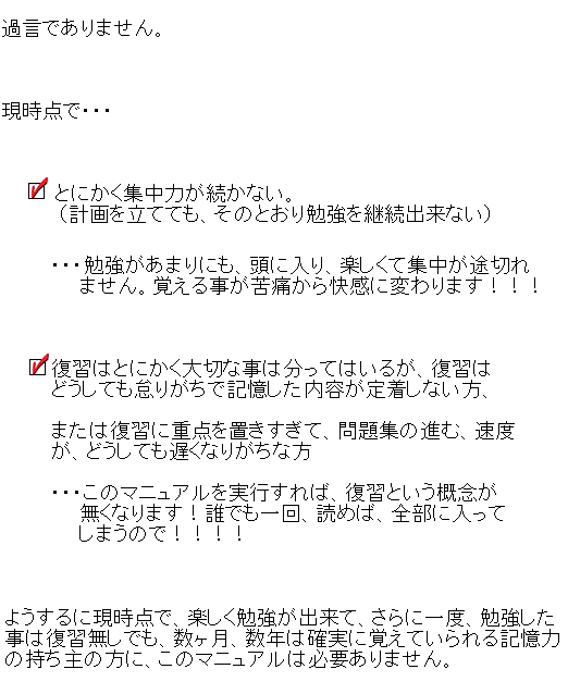 しかし、この「記憶術、速読術」を使う事で、問題集(新スーパー過去問ゼミ)を一冊を 覚えるのに3ヶ月掛かってた私が3日で一冊覚えられるようになりました。